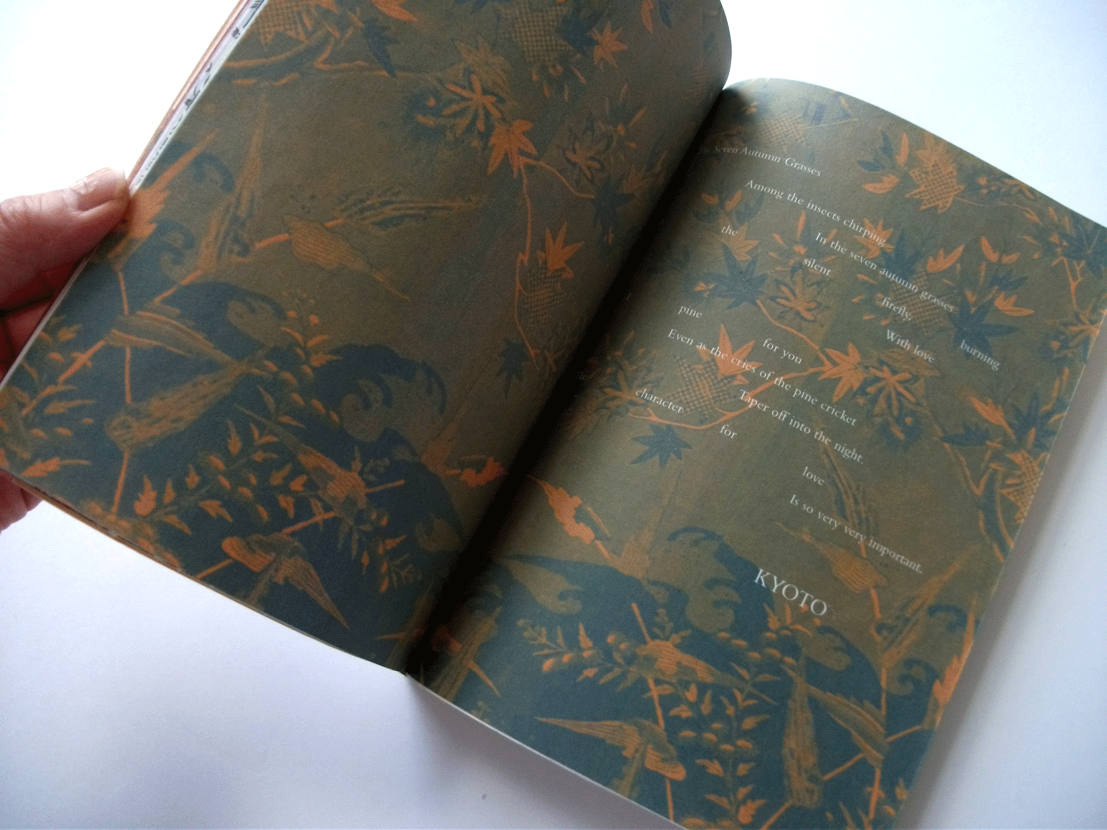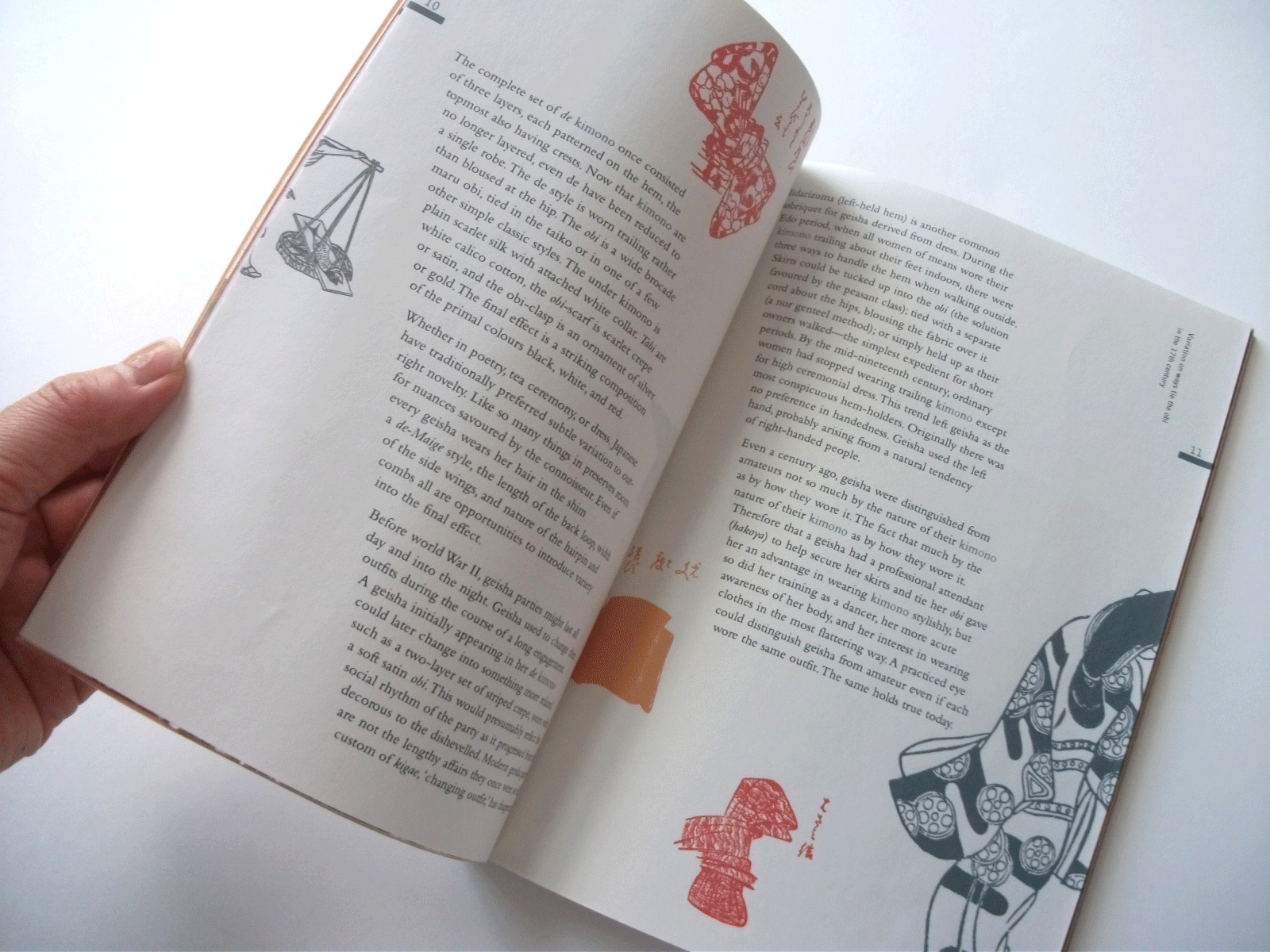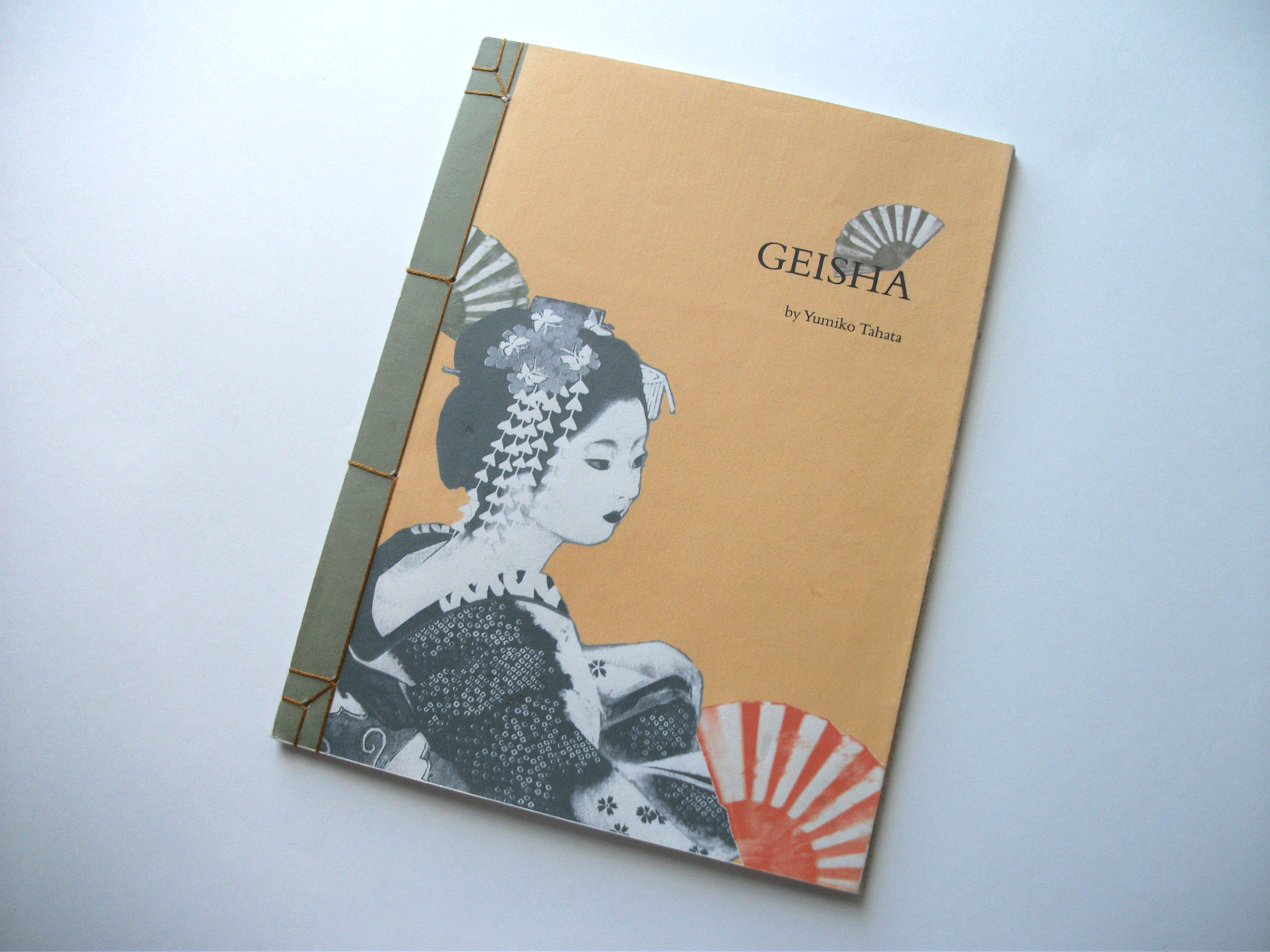 I wanted to design an authentic Japanese book about Geisha with a Japanese traditional bookbinding; Japanese stab binding, also known as Fukuro Toji (bound-pocket books). I printed some text and images inside of pouch.